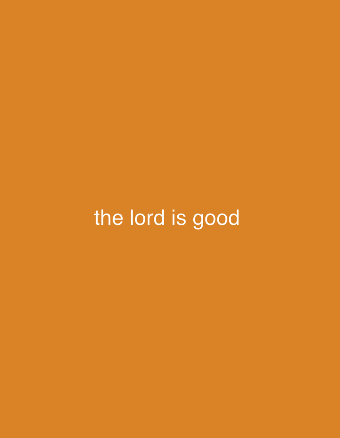 An orange background displays the phrase "the lord is good" in a simple, sans-serif typeface