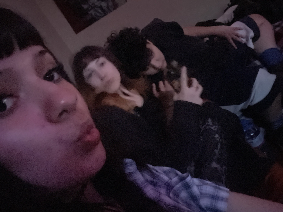 The image displays three individuals situated indoors within the city of Stara Zagora, Bulgaria. The scene is illuminated by dim, pink-purple light, contributing to a grainy visual texture. In the immediate foreground, the upper portion of a person's face is visible, including dark hair and eyes. The individual's lips are pursed, and part of a blue and white plaid shirt is visible on their left arm, suggesting they are holding the camera. Positioned behind and to the right of the foreground individual is a second person, a female with light brown hair and bangs, wearing a dark top. Her left hand is raised near her chin, and she is looking generally towards the camera, though her features are slightly out of focus. Further right and slightly below the second individual is a third person, a male with dark, curly hair, who appears to be seated or crouching. He wears a dark t-shirt and light-colored shorts with dark knee-length trim. His head is tilted downwards, and his right index finger is extended, pointing forward. His left hand interacts with a small, dark object. The left arm of the second individual rests over the shoulder of this third person. The background is dark and indistinct, featuring a dark framed item visible on the wall in the upper right. Clutter or folded fabric is present around the legs of the third individual.