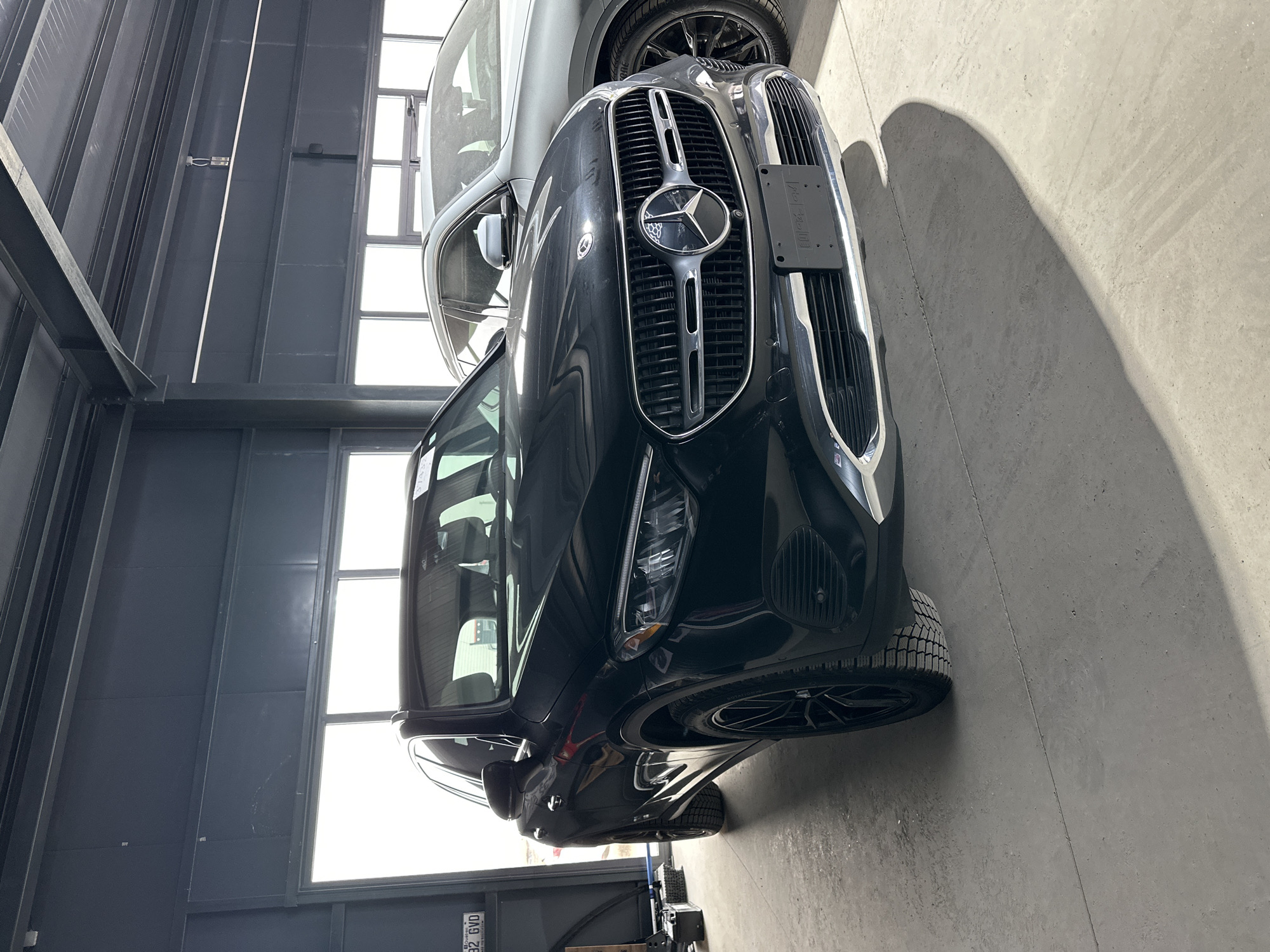 two cars parked indoors. The foreground car is a black Mercedes-Benz. The background car is light gray. The location appears to be a garage or warehouse-type space with windows providing natural light. The structure has exposed metal beams and a concrete floor. The license plate on the black car is visible. The exact location in Mramor, Bulgaria cannot be determined from the image.