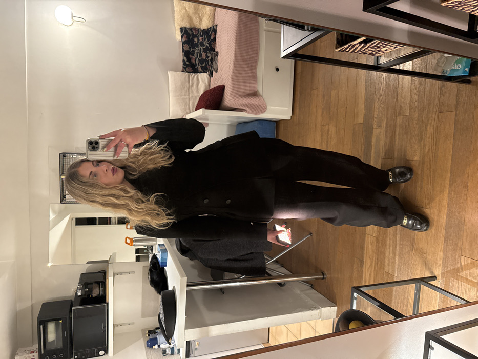 A woman with blonde wavy hair takes a selfie in a mirror. She wears a black jacket, black pants, and black loafers with gold embellishments. The room contains a bed with cushions, a shelf unit, a kitchen counter with appliances, and wooden flooring. The lighting is bright, and the mirror reflects the details of the surroundings.
