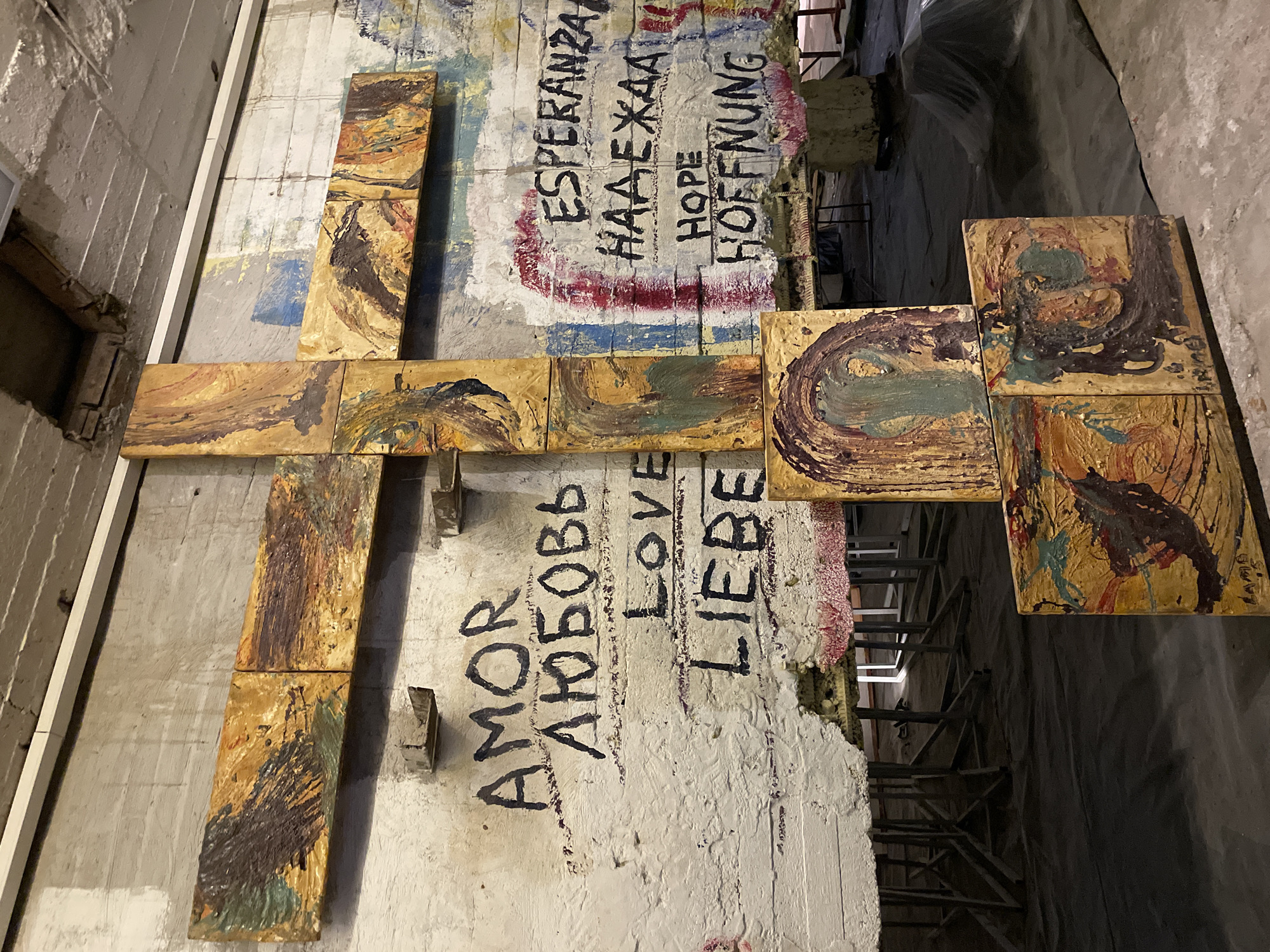 A large art installation, configured as a prominent Latin cross, stands against a textured, light-colored concrete wall within an indoor exhibition space at New Holland Island, Saint Petersburg, Russia. The cross is composed of numerous rectangular and square canvases, each featuring abstract, impasto-style painting with dominant earth tones, browns, golds, and greens, accented by occasional blues and reds. The concrete wall behind the cross is marked with graffiti in black script. On the left side, the word "LOVE" is written vertically in four languages: "AMOR," "ЛЮБОВЬ" (Russian), "LOVE," and "LIEBE" (German). On the right side, the word "HOPE" is similarly written: "ESPERANZA," "НАДЕЖДА" (Russian), "HOPE," and "HOFFNUNG" (German), with underlying vertical streaks of red and blue paint. The lower portion of the wall structure appears raised, revealing exposed metal support frames beneath it. The floor is covered with a dark, opaque material. The ceiling is exposed concrete with a linear white light fixture running horizontally across the upper frame of the image. No individuals are present in the scene.