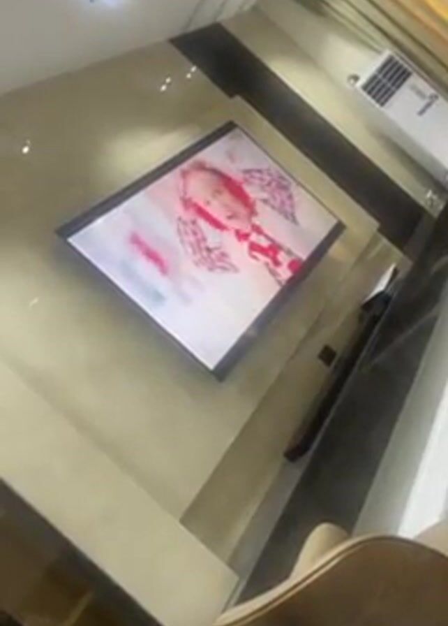 room with a large flat screen TV mounted on the wall. The TV is displaying various images of people in red, pink, and white clothing. A light colored chair is partially visible in the foreground. An air conditioning unit is on the wall above the TV. There are decorative lights on the ceiling. The room appears to have a modern aesthetic. Music is playing in the background.