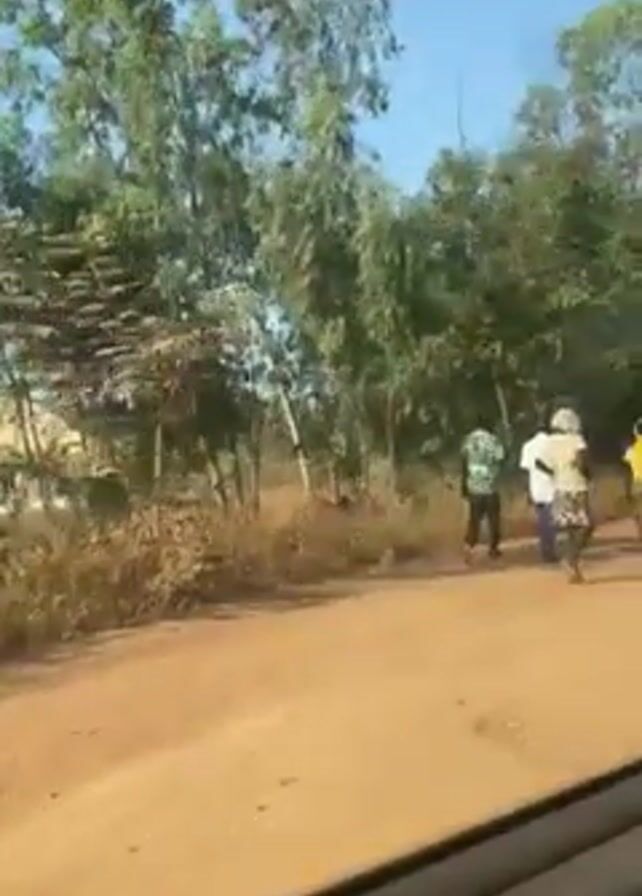 dirt road bordered by trees and shrubs. A group of people walk along the road, dressed in various casual clothes. The video is taken from inside a moving vehicle. The sky is blue.
