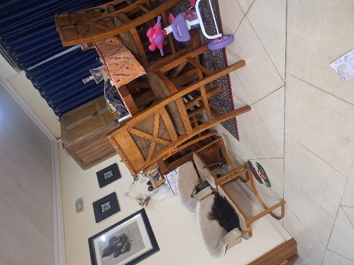 A rotated indoor scene features a partially visible blue curtain on the left, a wooden chest, and wall decorations including framed artwork and small square frames. A wooden desk with a patterned cloth on top is present, along with a child's ride-on toy. Below, a plush chair with wooden accents is visible near a rug. The floor is tiled.