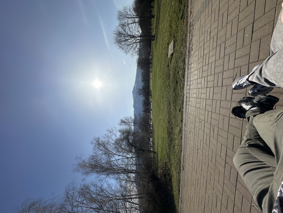 The image displays a bright, sunny outdoor scene in Sofia, Bulgaria, captured from a low, seated perspective. In the immediate foreground, the extended legs and shod feet of two individuals are visible. The individual on the left wears olive green trousers and dark, robust athletic shoes with light green details. The individual on the right wears light grey trousers and white and grey athletic sneakers. Both pairs of feet rest on a reddish-brown paver walkway, laid in a herringbone pattern. Beyond the paved surface, a wide, open expanse of green grass stretches into the midground, characteristic of a park. Scattered across this grassy area and along its perimeter are numerous deciduous trees, bare of leaves, indicating late winter or early spring. In the background, dominating the horizon under a clear, bright blue sky, is the snow-capped Vitosha Mountain. A prominent sun, slightly right of center, emits a strong lens flare. The overall scene suggests a leisurely moment in a public park in Sofia, specifically one with an unobstructed view of Vitosha Mountain, such as South Park (Yuzhen Park).
