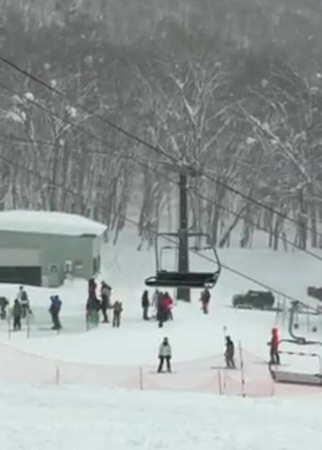 snowy ski area on a cloudy day. A ski lift runs up the slope in the middle of the frame, with empty chairs visible. People dressed in winter clothing are scattered on the snowy ground near the base of the ski lift, some on skis or snowboards, others standing or walking. A small light-colored building is visible to the left of the ski lift, and a vehicle is parked to the right. The background consists of snow-covered trees on a hillside. It is snowing lightly.