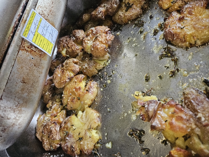 - "The image displays a close-up view of roasted smashed potatoes within a metal tray in a commercial kitchen setting" by FM-yfXT73, licensed under CC BY 4.0