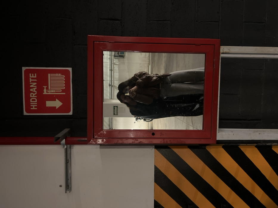 A red-framed mirror reflects two figures in a parking garage. One wears a brown jacket and light pants, while the other sports a dark jacket. The wall behind the mirror is black brick, with a "HIDRANTE" sign and a white-framed opening to the right. Below, the wall is painted white, segmented from yellow and black hazard stripes.