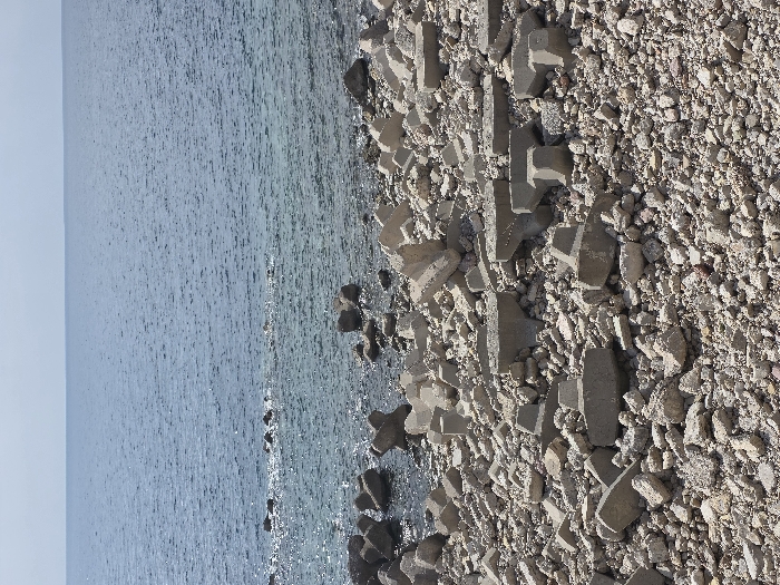 The image displays a coastal scene in Perazića Do, Montenegro. The foreground and mid-ground depict a shoreline composed of light-colored gravel, pebbles, and numerous irregular grey concrete fragments, including broken blocks and discernible remnants of multi-pronged wave-breaking units. This debris extends into the clear, shallow turquoise water, where additional rocks and concrete pieces are partially submerged. The upper portion of the image features the open sea, transitioning to a deeper blue with minor surface ripples, extending to a flat horizon under a pale blue, clear sky. No individuals, animals, or active subjects are present within the frame.