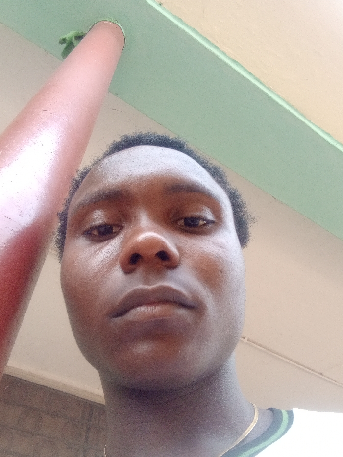 The image displays a close-up, low-angle portrait of an individual in Unguwan Sanusi, Nigeria. A young adult male with dark skin and short, dark, curly hair is positioned centrally, looking directly into the camera with a neutral expression. He is wearing a white garment with green and black stripes visible on the collar/shoulder area, and a thin gold-colored chain is around his neck. To the left, a reddish-brown cylindrical pillar extends vertically from the lower frame. Above and to the right of the subject, a light green painted ceiling or overhang is visible, bordered by a cream-colored surface. The scene is illuminated by ambient light.