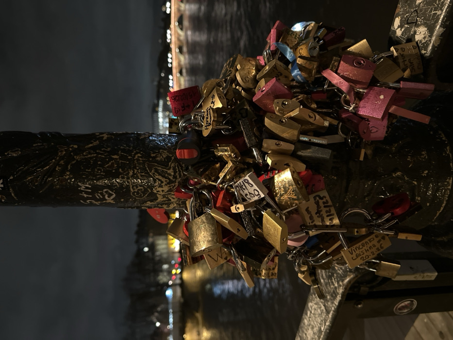 - "A close-up shows a black metal post adorned with numerous love locks of various shapes, sizes, and colors, including gold, pink, and red" by FM-4J30F3, licensed under CC BY 4.0
