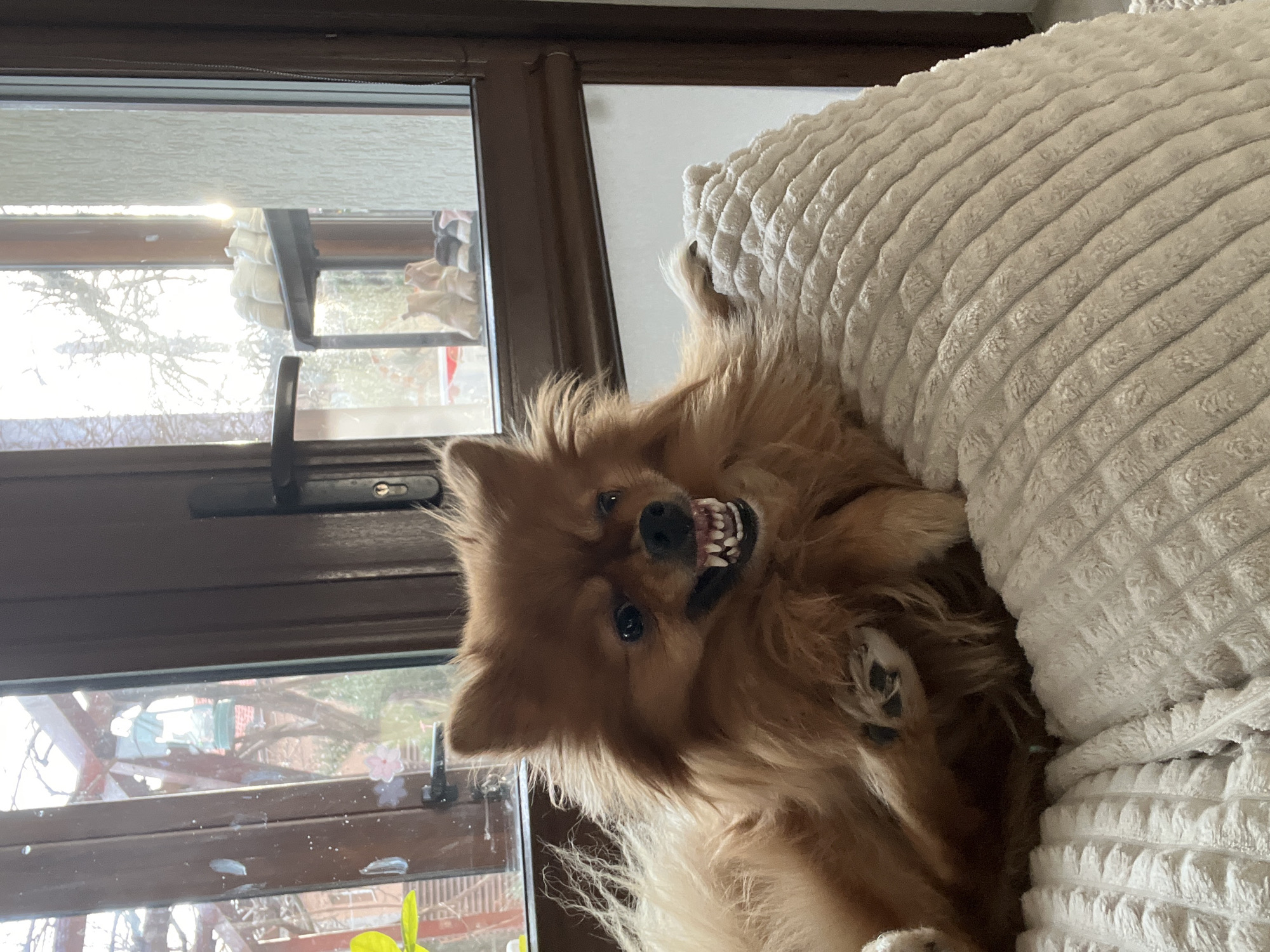 - "A brown, small-sized dog, possibly a Pomeranian or similar breed, is resting on a large, textured white cushion" by FM-32DQE2, licensed under CC BY 4.0