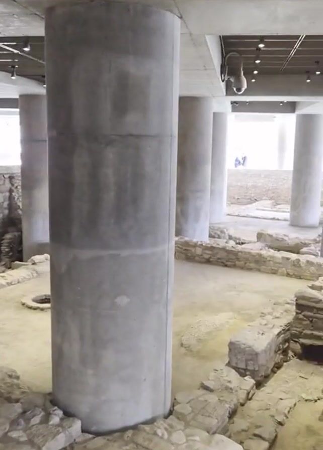 n indoor space with ancient ruins and modern structural supports. Large concrete columns stand among the ruins, which consist of stone foundations and walls. A walkway with metal railings runs around the perimeter of the ruins, allowing visitors to view them. People are seen walking along the walkway, observing the ruins. Some of them are looking at displays or exhibits behind a glass barrier. The space is lit by overhead lights. A person wearing a brown jacket with a white hood walks along the walkway, away from the camera.