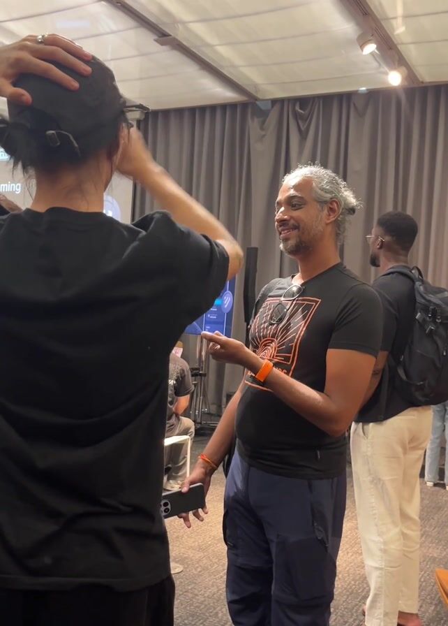 A man and a woman are standing face-to-face engaged in conversation in an indoor space. The woman, facing away from the camera, is wearing a black shirt and pants. Her hair is pulled back under a black cap. The man, facing the camera, is wearing a black t-shirt with a graphic print, blue pants, and sandals. He has graying hair pulled back in a bun. He holds a smartphone in his left hand. The woman raises her hands to adjust her cap and hair. The man gestures with his right hand as he speaks. In the background, a man with a backpack is standing a few feet away. There is a presentation screen visible in the background, as well as curtains and lighting fixtures.