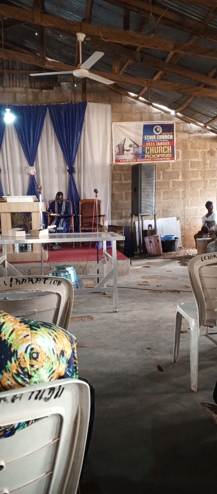 The image depicts the interior of a church identified by a banner as ECWA CHURCH Karatudu, Kaduna. The building has unfinished cinder block walls and a corrugated metal roof supported by exposed wooden rafters. A white, three-bladed ceiling fan is suspended from the roof structure. At the front of the room, a raised stage carpeted in red is backed by blue and white drapes. A male individual, wearing a dark blue robe with white trim and glasses, is seated in a dark wooden armchair on the stage, actively engaging with an open book, appearing to read or write. To his left is a light-colored wooden pulpit holding a white box and two cylindrical, shiny containers. To his right, an empty brown wooden armchair and a microphone on a stand are present. In front of the stage, a clear-topped table with a silver frame stands, with two blue drums or containers beneath it. On the right side of the room, a large banner is affixed to the cinder block wall. It displays the "ECWA CHURCH Karatudu, Kaduna" name, logo, and a "2023 TARGET: CHURCH ROOFING COMMITTEE" message, accompanied by an image of a church and its roof. Below the banner, a tall, dark grey speaker is placed on a stand. Further right, a woman in a white top and dark skirt is seated on a low stool, with a smaller, partially visible figure beside her. Assorted buckets and containers, including a pink one, rest on the floor near the wall. The concrete floor exhibits areas of wear and exposed earth. Multiple white plastic chairs, some marked with text such as "CHAMPTION" and "ECWA", are arranged in the foreground. The immediate foreground is partially obscured by the back of a person wearing a multi-colored patterned garment. Lighting is provided by bare light bulbs and ambient light filtering through the roof structure.