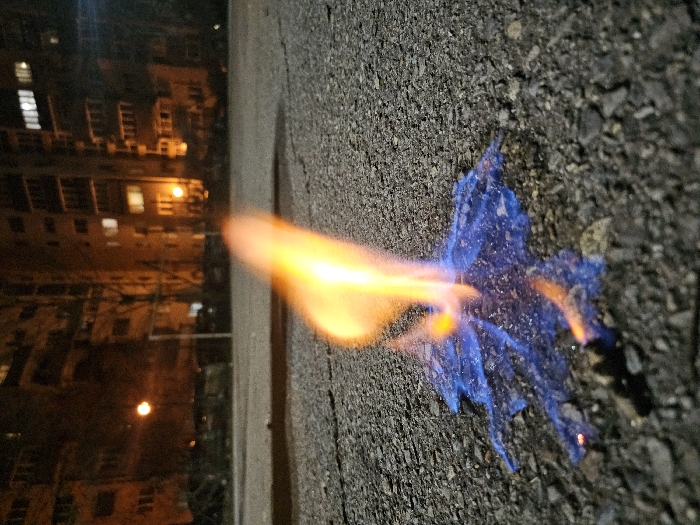 The image depicts a nighttime outdoor scene in Sofia, Bulgaria, captured from a low-angle perspective on an asphalt surface. In the immediate foreground, an irregularly shaped, molten blue substance, approximately 10-15 cm in its widest dimension, is actively burning directly on the dark, coarse-grained asphalt. A prominent, bright orange flame, roughly 20-30 cm tall, rises from the center of the blue material, with smaller, intense blue and orange flames visible at its base. Scattered dark debris or residue is present around the burning substance. The mid-ground shows a dark, open paved area. The background, significantly out of focus, reveals multiple-story residential apartment buildings with various illuminated windows, indicating interior lighting. One distinct orange-glowing streetlight is visible towards the left side of the background, and a faint white vertical structure, possibly a metal goalpost, stands in the distant middle-left. No individuals are visible within the frame.