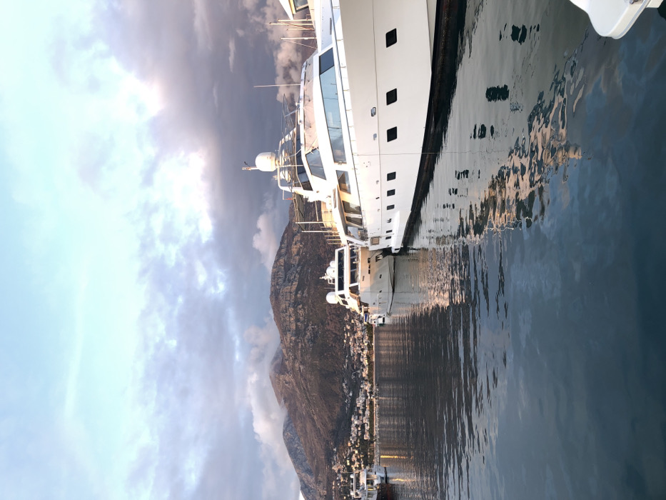 A luxurious white yacht, partially visible, dominates the right side of the image. Its reflection shimmers in the water, contrasting with the calm surface. In the background, a rugged mountain rises against a cloudy sky. A coastal town nestles along the base of the mountain, with small buildings and lights creating a picturesque scene. The lighting suggests either dawn or dusk, casting a soft glow over the landscape.