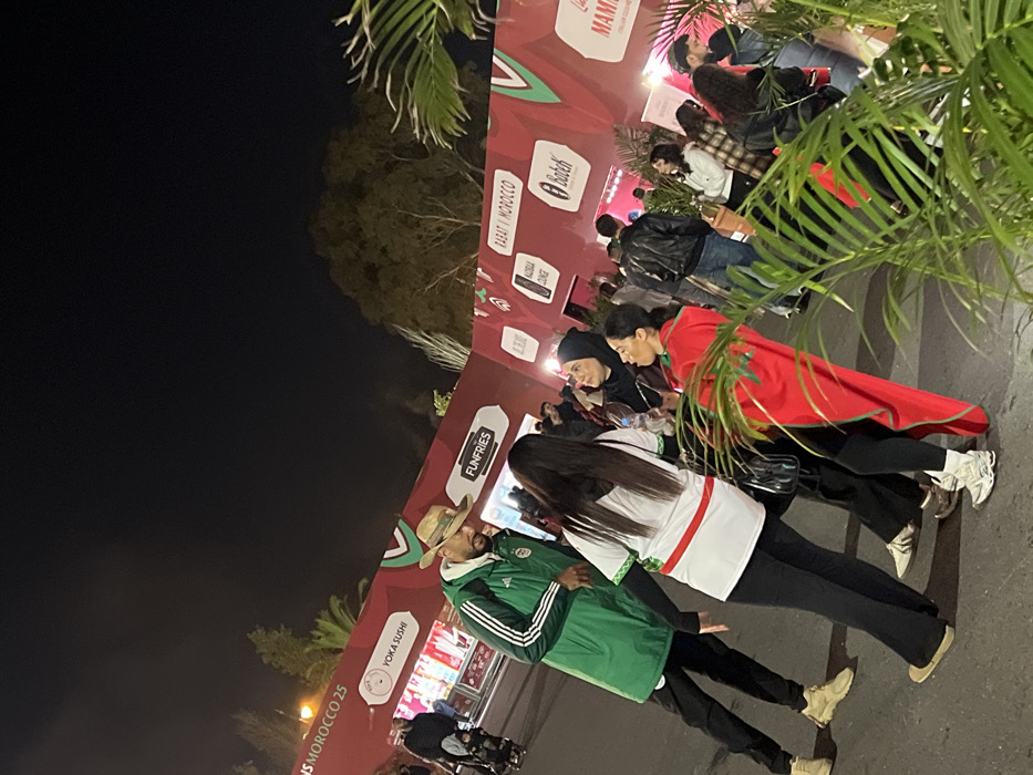 A nighttime scene presents a crowd near a sign displaying "MAMAS MOROCCO 25". People are dressed in celebratory attire, including a green jacket with white stripes and a red cape. The sign features logos of "FUNFRIES", "YOKA SUSHI", and other food-related businesses. Tall palm-like plants frame the scene, adding to the event-like atmosphere. The photograph appears to be slightly tilted.