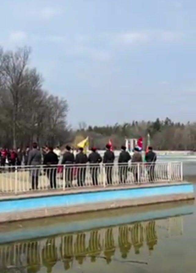 group of people in traditional clothing, standing on the edge of a rectangular pool. The people are mostly dressed in black or dark colors, and some are wearing red hats. They are holding various flags. A brass band is playing and the music is fairly loud. The pool is filled with clear water and there are trees in the background. The sky is blue with white clouds. The water in the pool reflects the scene, creating a mirror image of the people and flags. There is a white fence along the edge of the pool. The area seems to be a park or public space.