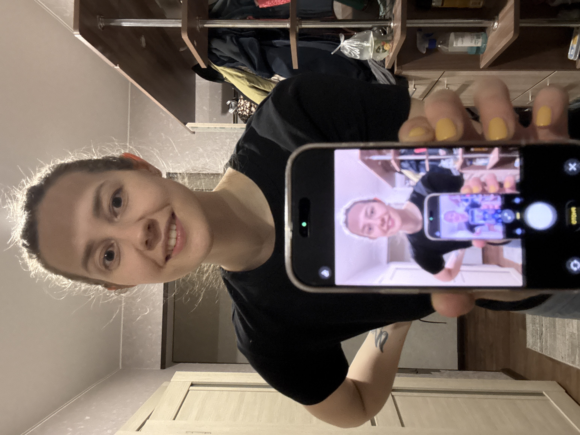 A woman is holding up her phone to take a selfie. She is wearing a black t-shirt and has her hair pulled back. Her fingernails are painted yellow. The phone screen shows a mirrored image of the woman taking the selfie, creating an infinite loop effect. Behind the woman, there is a closet with clothes and various objects on shelves. A door is visible on the wall behind her. It is difficult to ascertain the exact location in Chaikovsky, Russia from the provided image.