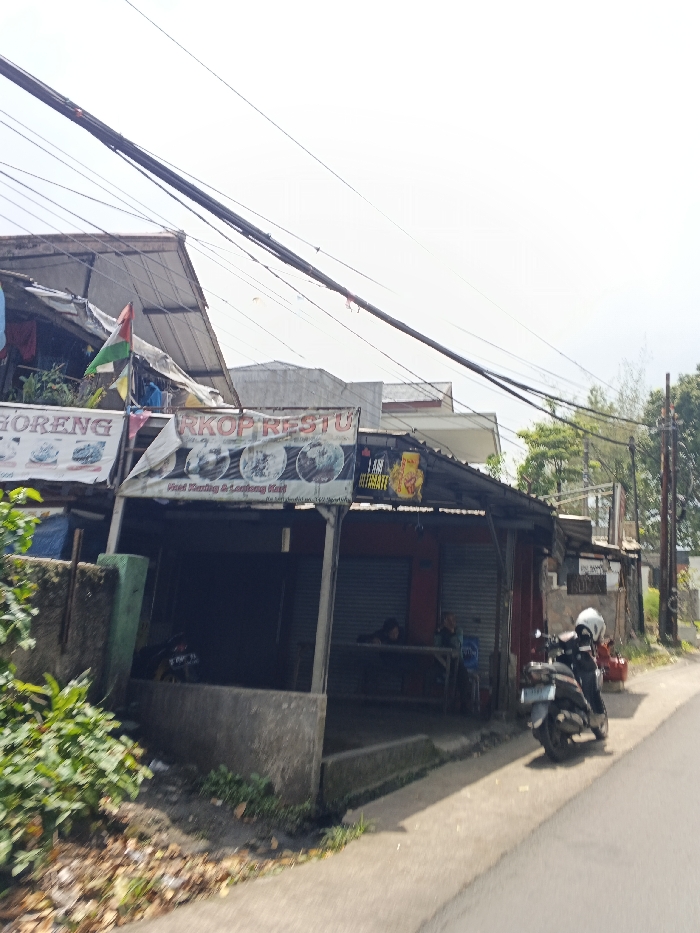 A side view of a small street-side restaurant with an awning and two banners. One banner has food images and the name "RKOP RESTU." A motorcycle is parked in front of the restaurant, and there appear to be two people sitting at a table inside. A flag hangs from a nearby structure. The road is to the right of the restaurant, and greenery is visible to the left. Overhead are several electrical or telephone wires.