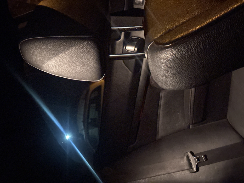 The image captures the interior of a vehicle at night in Zmeyovo, Bulgaria, viewed from a forward perspective looking towards the rear. In the immediate foreground on the right, a black, textured leather headrest of a front seat is prominent, displaying metallic support rods. To the left, a portion of the black leather rear passenger seat is visible, featuring a metallic seatbelt buckle on its left side. The interior door panel is discernible in the mid-ground, characterized by a horizontal dark trim piece. Outside the vehicle, through a window, a bright circular light source is visible in the upper left, emitting a distinct blue lens flare diagonally across the frame. The roof and upper body of another vehicle, appearing light-colored, are faintly visible behind the light source against the dark night environment. No individuals or active interactions are depicted in the scene.