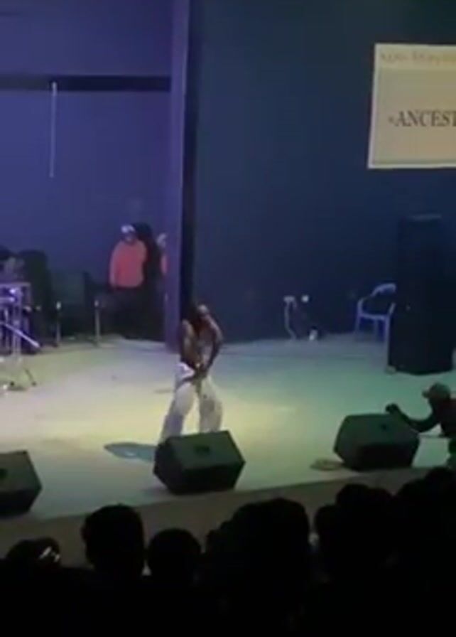 A dark-skinned man stands shirtless on a stage, lit with a blue-purple light, wearing white pants and facing an audience. He is in the middle of a dance performance. A large banner is visible behind him that says, "NOW PERFORMING: ANCESTOR." There are stage speakers placed on the floor around him. In the background, two people are standing in the wings. The audience sits in the foreground, with their heads visible.