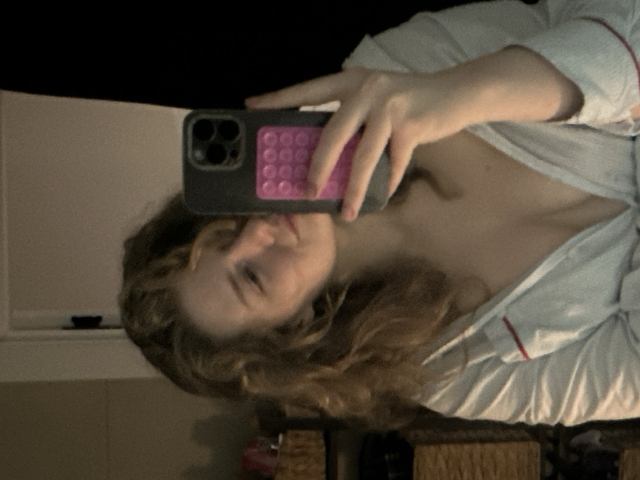 A female individual is depicted in what appears to be an indoor setting, capturing her reflection using a smartphone. The subject has medium-length, wavy, light brown or auburn hair. She is wearing a light-colored, possibly white or light grey, button-up shirt featuring red piping along the collar and cuffs, which is unbuttoned to reveal her upper chest. Her face is partially obscured by the phone, showing a soft expression with eyes seemingly downcast or closed. She holds a dark-cased smartphone in her right hand, which features a prominent multi-lens camera array and a pink, multi-bubble fidget accessory attached to its back. The background to the left reveals a light-colored wall, a dark door hinge, and a section of a woven storage unit containing indistinct items. The background to the right is largely dark and unidentifiable. The location cannot be ascertained from visual evidence within the image.