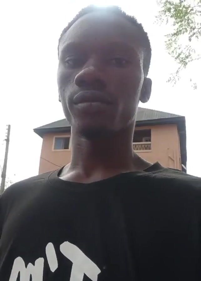 A young, dark-skinned man is filming himself from a low angle, looking directly at the camera