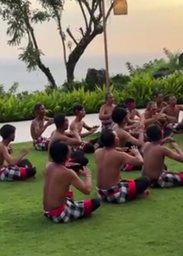 A group of about fifteen men is sitting cross-legged in a circle on a lawn. Most of them are bare-chested and wearing checkered sarongs. They appear to be engaging in some type of performance or ritual, as they are moving their arms and hands in unison, and chanting a repetitive sound. The lawn is bordered by a hedge and some trees. In the background, there is a view of the ocean. The lighting suggests it is late afternoon or early evening.