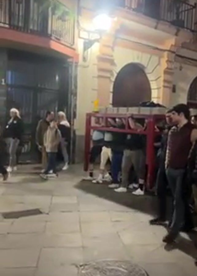 A group of people stand around a red metal structure in an urban environment. Some individuals are partially obscured, positioned underneath the structure with their heads and upper bodies visible between the horizontal bars. Others stand outside the structure observing. The group is on a sidewalk with a manhole cover. Buildings line the street, showing details like wrought iron balconies, orange and cream painted walls, and lighted windows. People walk by in the background. The scene is dimly lit by overhead streetlights.