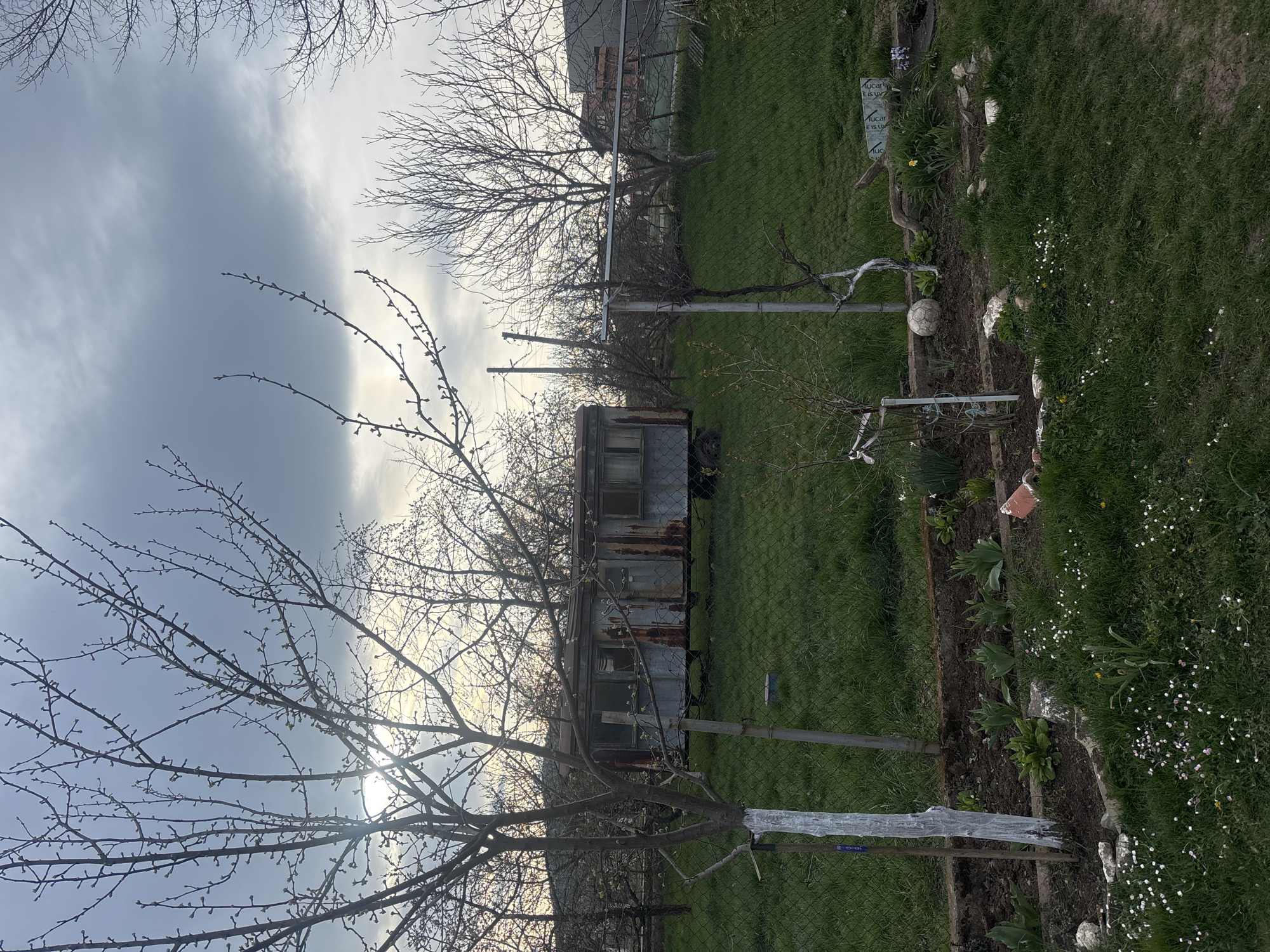 view from a residential garden in Dolna Dikanya, Bulgaria. The scene is dominated by an overgrown grassy yard partially enclosed by a chain-link fence. A dilapidated, rusty metal structure, possibly an old trailer or shed, stands against the back fence, partially obscured by bare-branched trees beginning to bud, suggesting early spring. The ground is covered with grass interspersed with small white wildflowers. A raised garden bed runs along the right side of the image. The sky is overcast with some areas of brighter sunlight peeking through. No people are visible in the image.
