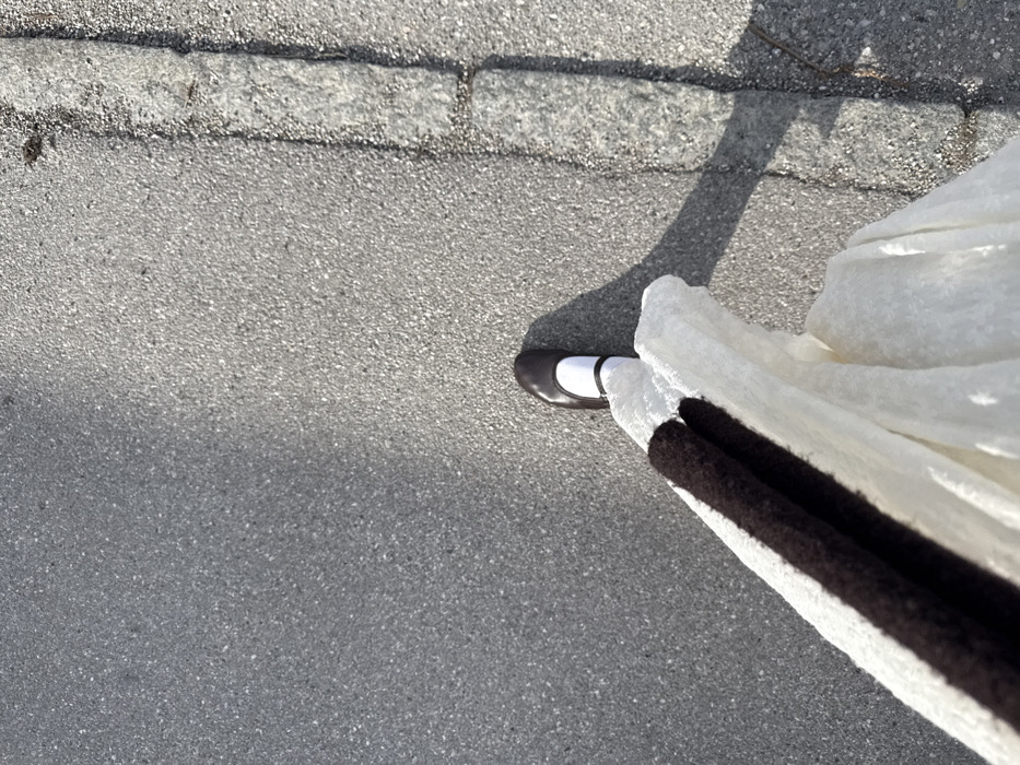 In Gauting, Germany, a high-angle, downward perspective captures the lower portion of a person in mid-stride on a paved surface. The ground consists of grey, granular asphalt on the left, delineated by a light grey stone curb constructed from individual blocks running vertically along the right side of the frame. A single foot, clad in a dark brown Mary Jane shoe with a white strap and a white sock, is visible in the upper-middle right, casting a distinct shadow to the lower right. A white, textured garment, resembling a flowing dress or skirt, with a prominent vertical dark brown band, occupies the lower left portion of the image, obscuring the wearer's leg and casting a soft shadow. The scene is illuminated by direct sunlight, indicated by sharp shadows.