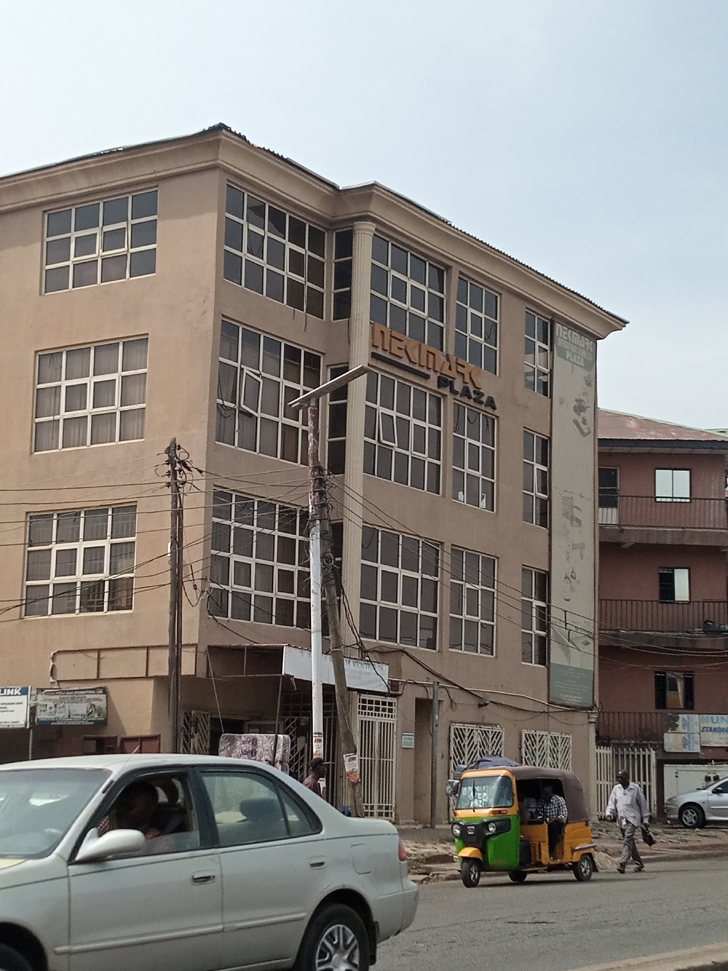 This image captures an urban street scene in Sardauna, Nigeria, featuring a multi-story commercial building, vehicular traffic, and pedestrians under daylight conditions. The prominent structure is a four-story light brown building identified as "NEKIMARK PLAZA" by dark brown lettering on its facade and a faded vertical banner on its right side. The building features numerous grid-patterned windows with white frames; several upper-story windows are partially open. Entrances on the ground floor are secured by white metal gates. To the right, a reddish-brown multi-story building with multiple windows and dark railings is visible. In the foreground, an asphalt road occupies the lower portion of the image. A light-colored sedan, with a driver visible, is partially visible on the left, moving left-to-right. In the middle ground, a green and yellow three-wheeled auto-rickshaw, containing two occupants, travels left-to-right. A male pedestrian, dressed in a light-colored long-sleeved shirt and striped trousers, walks right-to-left along the roadside on the right, carrying a dark bag. Further down the street on the right, a white sedan is parked beside another building. Multiple wooden utility poles, burdened with a dense network of black electrical wires, stand in front of the Nekimark Plaza building. The sky above is clear and pale blue.