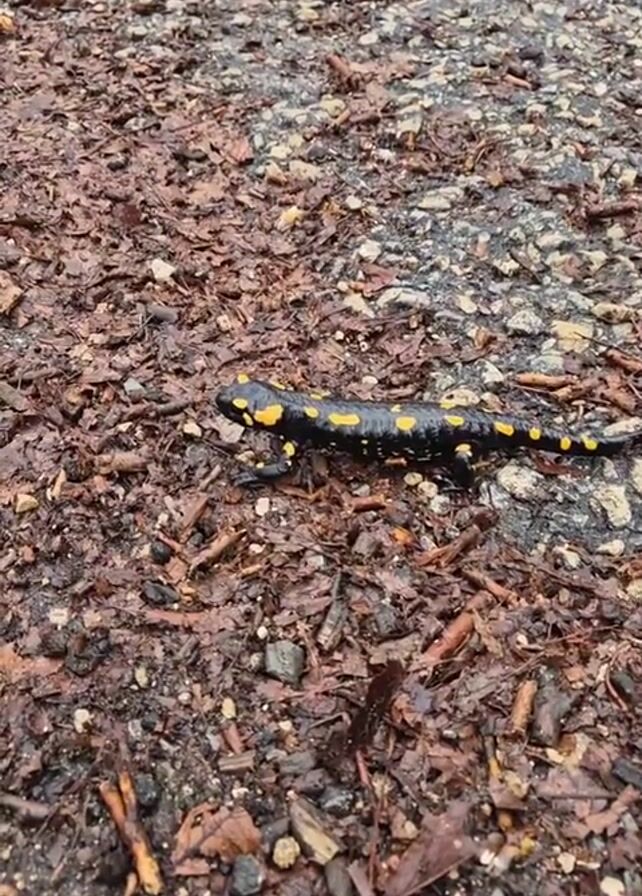 - "A black salamander with yellow spots crawls across a background of dark brown leaves and stones" by FM-i5YF22, licensed under CC BY 4.0