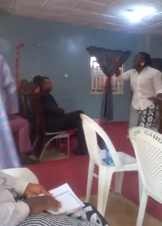 The video depicts a room with people seated and standing. A woman in a white blouse and patterned skirt appears to be speaking animatedly, gesturing with her arms. A man in a patterned robe is standing and gesturing toward her. Another man is sitting with his arms crossed, looking at the woman. Other people are seated in the background. There are white plastic chairs, a table, and papers or documents on laps. The walls are painted blue, and there's a window with curtains. The lighting is bright.