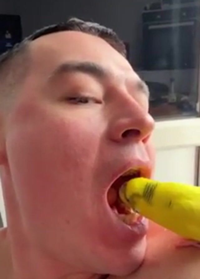 bare-chested man from the chest up, facing the camera in what appears to be an indoor setting. His mouth is open and a small yellow parakeet is inside, pecking at food between his teeth. The man closes his mouth and pulls away slightly, the parakeet then perches on his shoulder. The man looks directly into the camera with a small smile. A blurry kitchen can be seen in the background.
