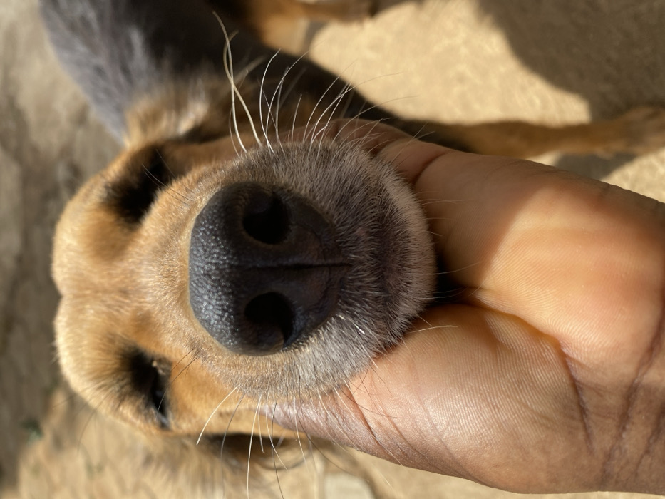In Maigizo, Nigeria, a close-up photograph depicts a brown and tan domestic dog. The dog's face, featuring a prominent black nose and white whiskers, is centered in the frame. Its eyes are closed, indicating a state of relaxation or comfort. A dark-skinned human hand is positioned beneath the dog's lower jaw, gently cupping its muzzle. The scene is illuminated by bright natural sunlight, creating strong highlights on both the dog's fur and the human hand, and casting soft shadows in the out-of-focus background. The blurred background appears to be an outdoor, light-colored ground surface, possibly dirt or sand.