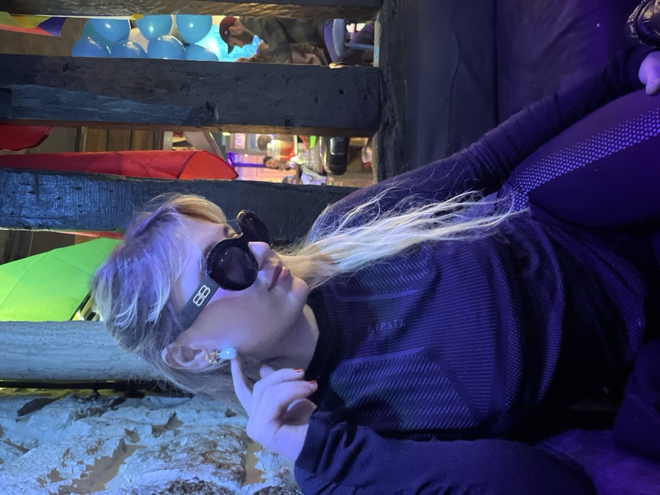 The image depicts an indoor scene within an establishment in Paris, France, characterized by low, artificial lighting with a prominent blue and purple hue. In the foreground, a blonde-haired individual, likely female, is seated, facing away from the camera's direct line of sight with her head slightly tilted down and to the left. She wears large, dark, round sunglasses with "BB" branding visible on the right temple arm (viewer's left). Her attire consists of a dark long-sleeved athletic top with a textured pattern and a "KIPSTA" logo on the chest, paired with dark leggings featuring a dotted pattern stripe on the side. A prominent, ornate earring with a gold-toned setting and a teardrop-shaped light blue or white stone is visible on her right ear. Her right hand, adorned with red nail polish, is raised, with fingers touching the earring. The background reveals structural elements including a light-colored, rough-textured wall on the far left, and multiple dark wooden beams or pillars that segment the space. Between these beams, elements of a lively environment are visible. Hanging fabric banners, one green and one red, contribute to the decor. Further into the mid-ground, other patrons are present. On the far right, a man wearing a red baseball cap and a plaid shirt is partially visible, seated. Behind him, a cluster of numerous light blue balloons suggests a celebratory atmosphere. Another indistinct figure is visible further left, near a table with a pitcher containing a red beverage. The overall environment suggests a casual social gathering or event within a venue that incorporates stone and wood architectural features.