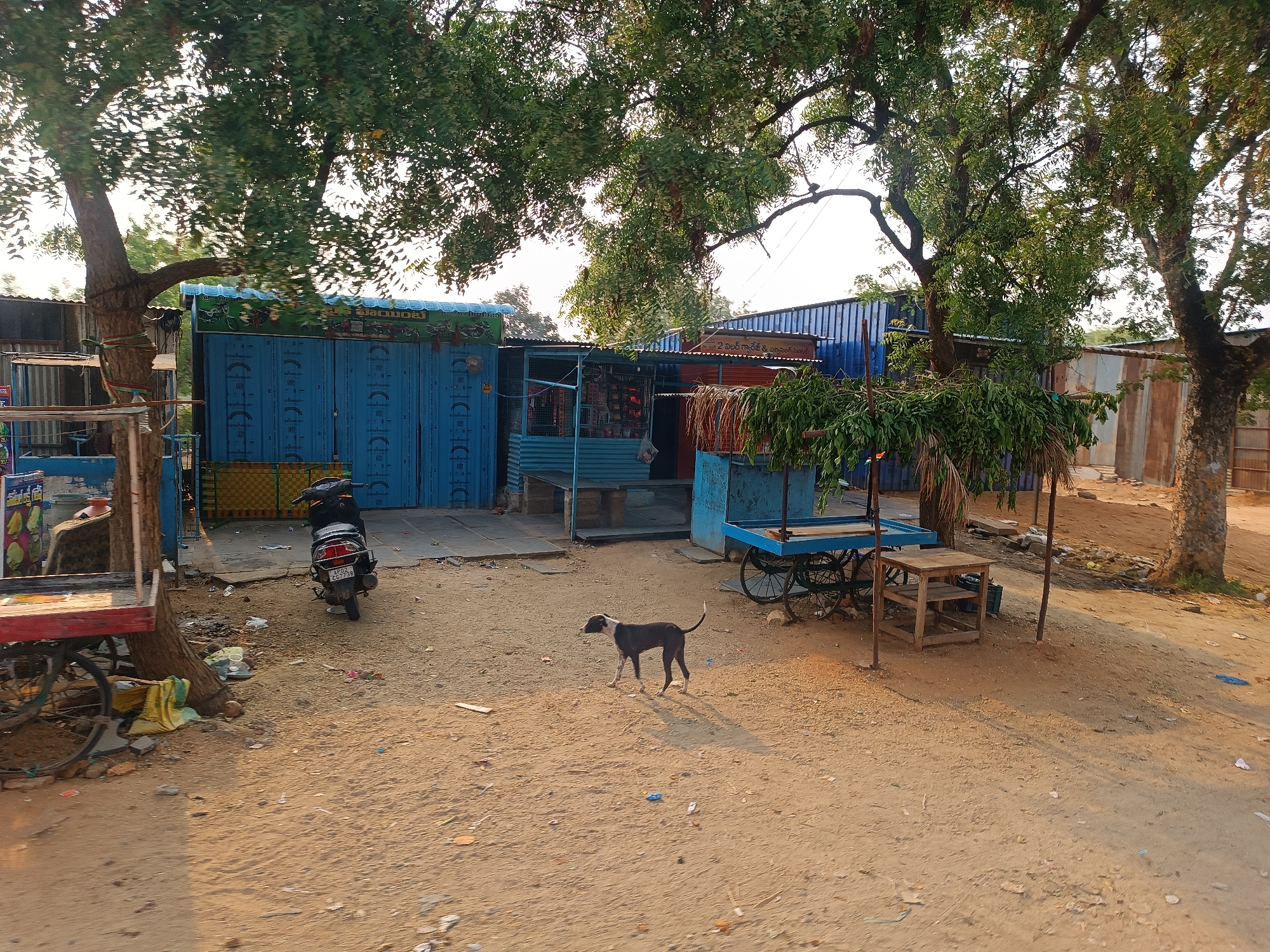 The image depicts an outdoor scene in Kothacheruvu, India. The ground is sandy and strewn with litter. In the background are several small businesses with blue metal shutters, and some shops with open fronts. A black and white dog stands in the center of the frame. A scooter is parked near the shops. Various wooden carts and tables are scattered around the area, some under trees. Trees with dense foliage provide shade over the scene.