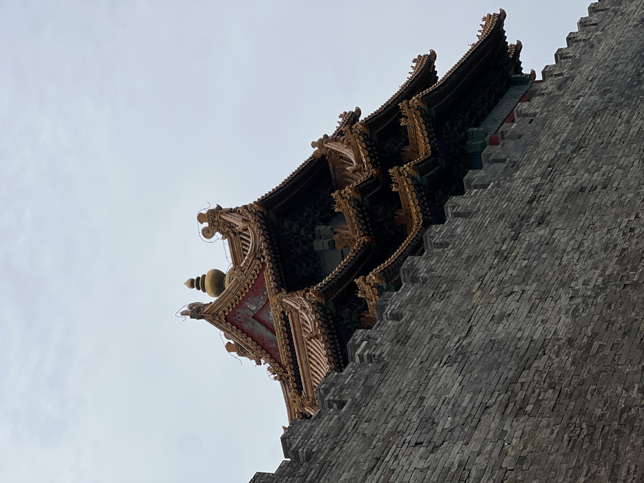 - "The image displays a close-up, upward-angled view of an ornate, multi-tiered traditional Chinese architectural structure, partially obscured by a substantial stone wall, under an overcast sky in Xicheng District, China" by FM-U93nI3, licensed under CC BY 4.0