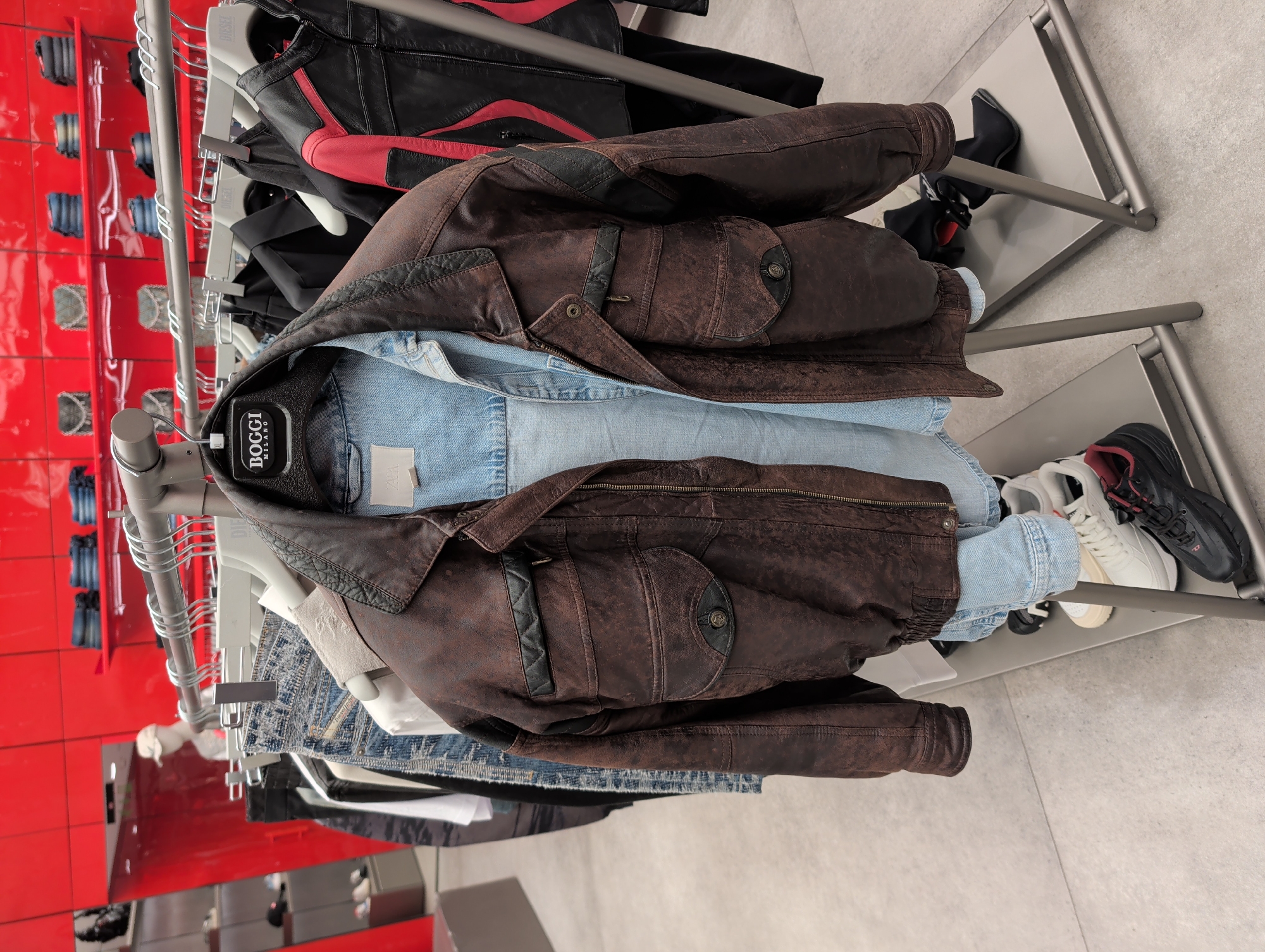 clothing rack in a store, presumably in Sofia, Bulgaria. The rack contains a variety of clothing items, including a brown leather jacket, a light blue denim shirt, and other jackets in black and red. A "BOGGI Milano" brand tag is visible on the denim shirt. Below the hanging garments, there's a shelf with several pairs of shoes, including black and white sneakers. The backdrop includes a red tiled wall on the left and a grey tiled floor on the right. The clothing is arranged on hangers and the rack is made of metal.