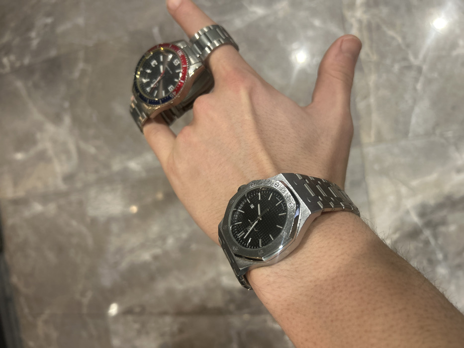 A light-skinned human forearm and hand are depicted from a slightly elevated perspective, extending over a polished, light grey marble or tiled floor which reflects ambient light. A silver-toned wristwatch, featuring an octagonal bezel, a textured black dial, and an integrated metal bracelet with a distinctive link pattern, is worn on the left wrist. This watch displays a visible date complication. A second silver-toned wristwatch, characterized by a round case, a black dial, a bi-color red and blue rotating bezel, and a link bracelet, is balanced on the index and middle fingers of the same hand. The scene is indoors, located in the city of Varna, Bulgaria.