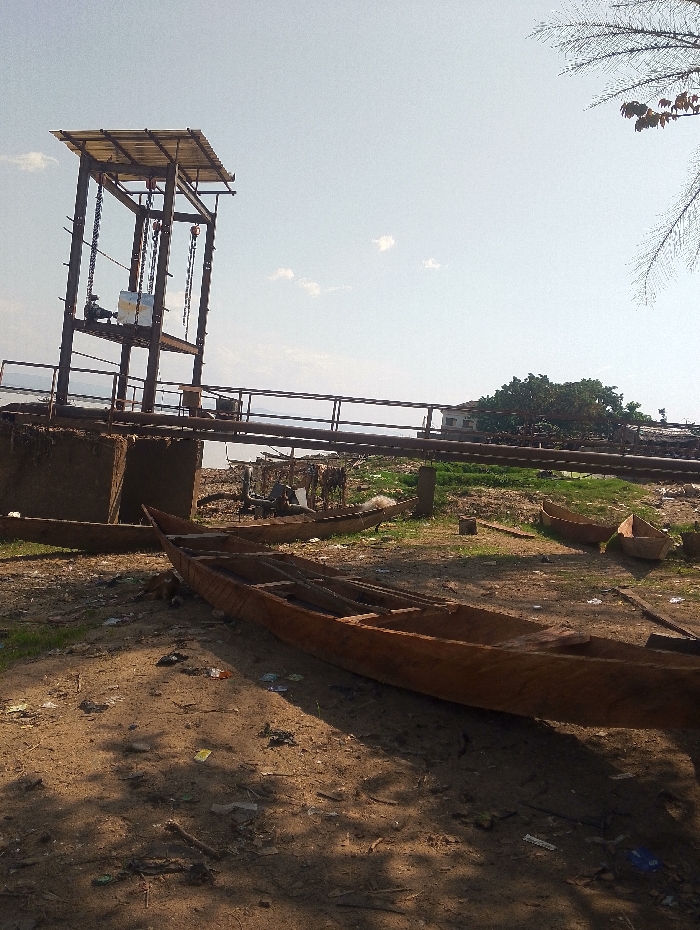 The scene depicts a riverside or lakeshore area in Lokoja, Nigeria, under a clear sky with scattered clouds. The foreground consists of sandy-dirt ground, littered with debris including plastic wrappers and small fragments. Three wooden dugout canoes are present; one large, unpainted canoe dominates the lower-center, oriented horizontally. Two smaller canoes are visible further back on the right. In the midground, a dark metal gantry structure, featuring a sloped corrugated metal roof, stands on concrete pillars. Visible chains and pulleys within the structure indicate a lifting mechanism. A single individual, dressed in dark clothing, is positioned on the gantry platform, appearing to interact with or monitor the mechanism. A metal walkway with railings extends horizontally from the gantry towards the right. Beyond the gantry, a body of water is visible, with distant land, green vegetation, and a white building discernible on the far bank or along the shore. Foliage from a tree partially obscures the upper right corner of the image. Distinct shadows are cast on the ground by sunlight.