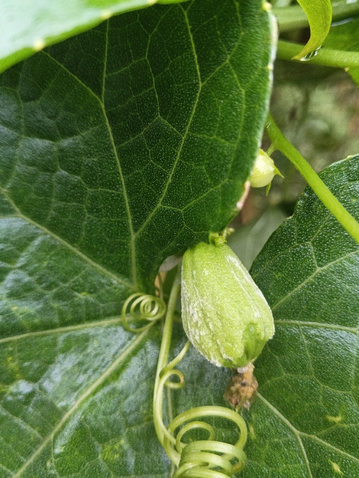 A macro photograph captures a detailed close-up of a plant in Kwekwe, Zimbabwe. The central focus is a light-green, ovoid fruit or large bud, approximately 3-4 cm in length, covered in fine white fuzz or trichomes. It hangs slightly downwards, attached by a short stem, with a shriveled brown calyx or residual floral parts at its base. Surrounding this central element are multiple dark-green leaves, exhibiting pronounced venation and a finely textured, possibly granular or pebbled, surface. One large leaf partially occupies the upper-left and central-left portions of the frame, obscuring elements behind it. Several coiled, light-green tendrils are present; a prominent tendril spirals upwards from the lower-left quadrant. A smaller, undeveloped light-green bud is visible in the upper-right quadrant, near a leaf edge where a single, clear water droplet rests. The scene depicts a static state of natural plant growth. No human figures, animals, or artificial objects are visible.
