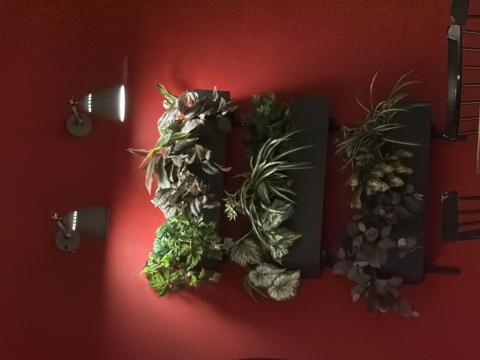 The scene depicts an interior wall in Izhevsk, Russia. A vibrant, textured red wall dominates the frame. Two grey metallic wall sconces, each featuring a downward-pointing conical shade, are mounted on the upper portion of the wall, emitting cones of bright light onto the surface below. Directly beneath these lights, a three-tiered vertical garden system is affixed to the wall. Each tier consists of a dark-colored, rectangular planter box. The planters are filled with a variety of green and multi-colored foliage, consistent with indoor decorative plants. The top planter contains dense, brighter green leaves alongside darker, reddish-toned foliage. The middle planter displays plants with distinct striped leaves, resembling spider plants, intermingled with broad, grey-green leaves. The bottom planter features darker green and somewhat variegated leaves, with some trailing elements. The tops of two dark, slatted wooden chairs are visible at the very bottom edge of the image, indicating the presence of seating, likely arranged around a table. No individuals are present in the frame.