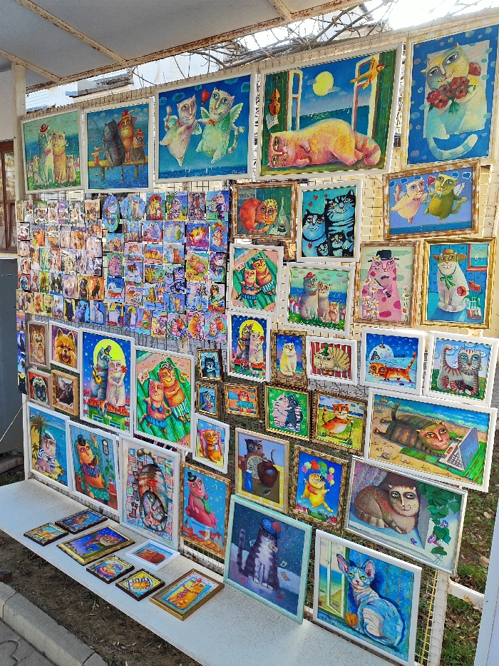 An outdoor art market stall in Yevpatoriya, Ukraine, is densely populated with over one hundred colorful artworks