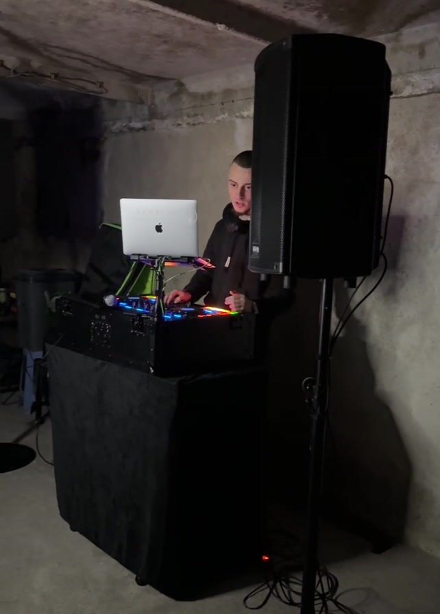 young man DJing in a dimly lit, unfinished basement-like room