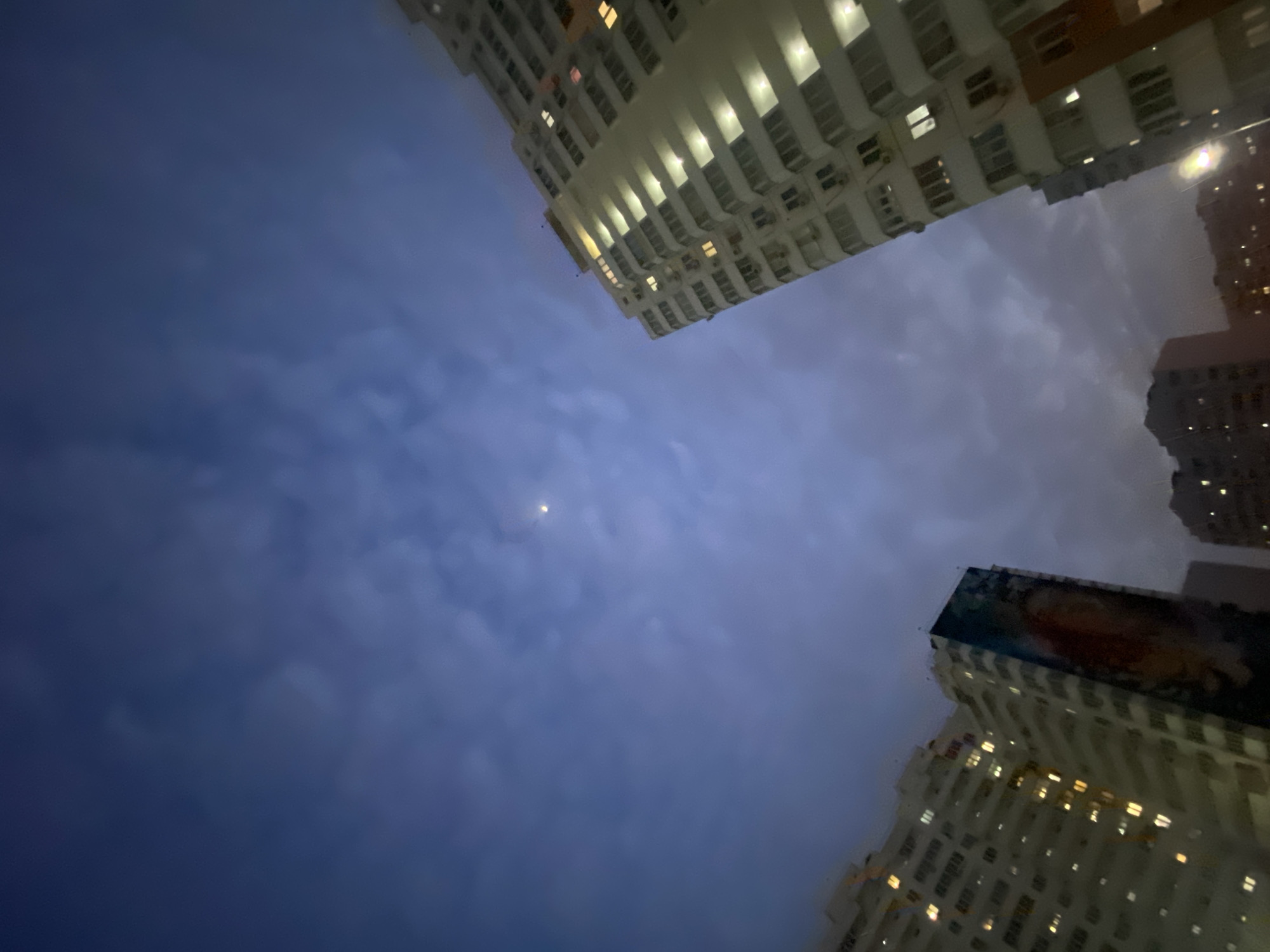 The image displays an urban night scene in Unknown, Unknown, captured from a low-angle perspective looking upward. The sky is dark blue-gray, partially covered by scattered clouds, with a distinct crescent moon visible near the upper center. Multiple high-rise residential buildings dominate the foreground and midground. A tall, light-colored building on the right exhibits numerous illuminated windows and balconies. On the left, another similar multi-story, light-colored building also presents several illuminated windows. Positioned centrally between these, a taller building features a large, colorful mural on one of its visible facades, depicting a stylized face or figure in reds, blues, and black. Further in the background, additional darker buildings with some illuminated windows are discernible. A bright streetlamp is partially visible on the lower right. No individuals, specific actions, or interactions are present within the frame.