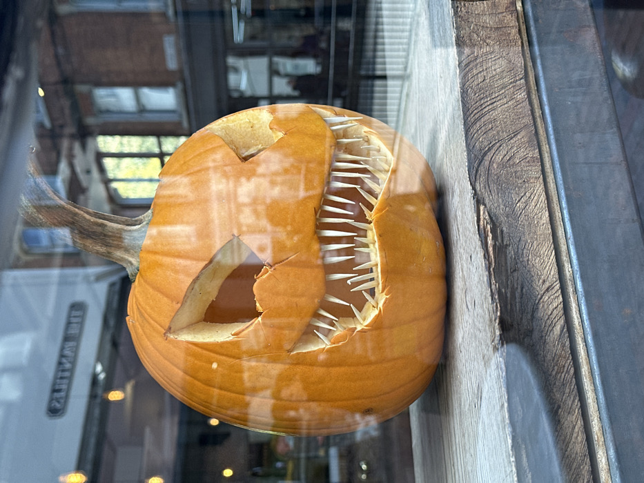 A medium-sized, orange jack-o'-lantern is positioned on a rough-hewn, light brown wooden surface, likely a shop window display